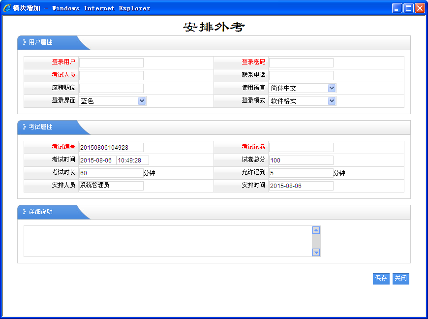 1、用户属性:就是外部人员临时设置的一个帐户进行登录系统进行考试。
