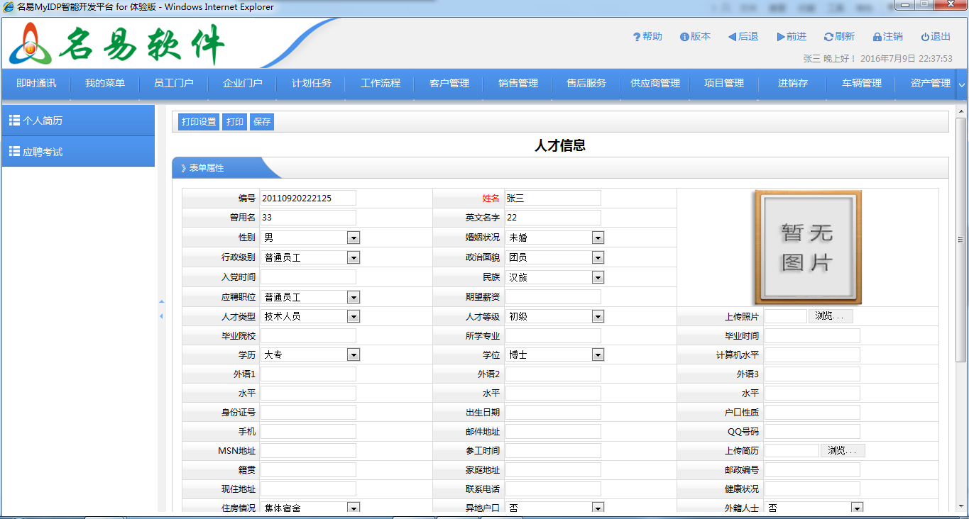 1、个人简历:应聘人员填写自己的简历,这里填写后的简历会在“人才储备”中看到