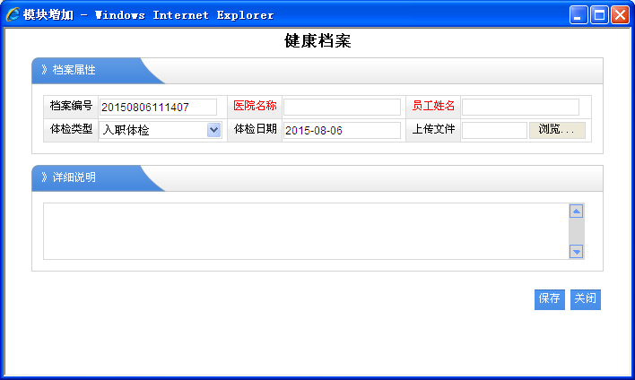 1、员工姓名:必须选择对应的职员名称,那么该健康档案是就属于该职员的。