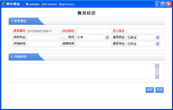 1、员工姓名:必须选择对应的职员名称,那么该教育经历是就属于该职员的。