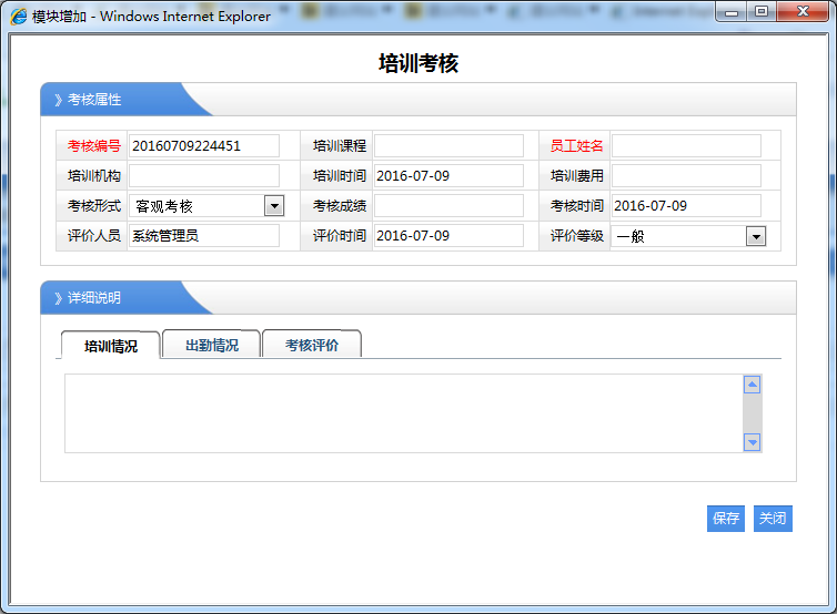 1、员工姓名:选择对那个员工进行的培训考核。