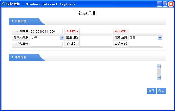 1、员工姓名:必须选择对应的职员名称,那么该社会关系是就属于该职员的。