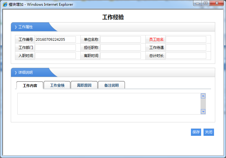 1、员工姓名:必须选择对应的职员名称,那么该工作经历是就属于该职员的。