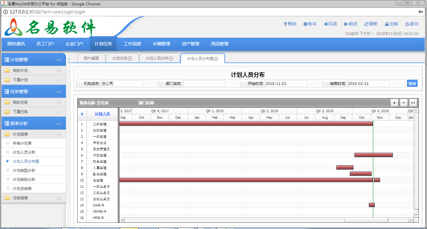 报表分析 计划报表 所有计划表;计划人员分析;计划人员分布图;计划类型分析;计划类别分析;计划总表