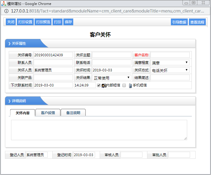 5、投诉登记:在客户关怀过程中,客户可能对服务人员,产品不满意而进行投诉登记记录