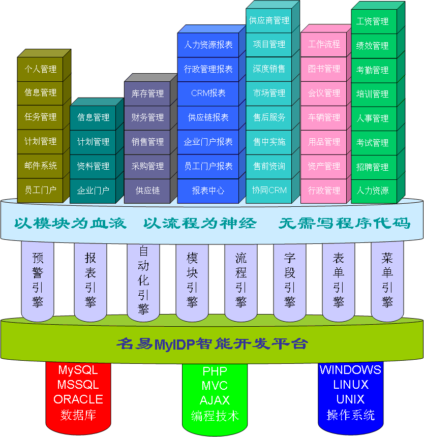 名易MyIDP智能开发平台是一款完全基于“菜单+表单+流程+权限”无需写程序代码进行二次开发出适合自己业务流程的开发软件平台,在此平台上已经开发出“自动化(OA系统),客户关系管理(CRM系统),人力资源管理(HR系统),进销存管理”等管理系统![]() 一、开发背景 在当今这个快速发展的社会,每个企业都有不同的管理模式,不同的管理流程,很多个性化需求,要把企业的管理模式容入信息化建设中,作为一个软件开发商,要把各式各样管理流程的容为一体,灵活变通,是件非常困难的事情,再说社会在快速的发展,企业管理模式当然也不断的创新,工作流程也不断的在优化,信息化软件更难以快速也企业的管理同步。总结以上的问题,我推出一套全新的解决方案,完全按照企业的各自的需求,快速的开发自已的业务系统,无需写程序代码。完全基于“菜单”+“表单”+“流程”+ 模块”+“报表”+“权限”控制,快速满足以“需”应变的客户需求;满足客户未来需求的完美解决方案! 二、设计原则 名易MyIDP智能开发平台为用户体现了完美的系统性能,它以应用为核心,以实用、易用、好用三大主线为出发点,充分考虑用户的实际需要、投资能力和使用习惯,全面兼顾技术、应用与发展的和谐统一。既注重实效,满足用户的现实需要,又为系统的后续升级和扩展留有余地,大大提升了各项指标和整体性能: A、实用性原则:满足用户现实需要,解决实际问题,做细核心功能,兼顾辅助功能,实现快捷、可靠地布署和使用,并节省投资。 B、易用性原则:各项功能一目了然,满足用户的使用习惯,易使用、易维护、易升级,实现“傻瓜相机”式的操作,将实施、培训成本和周期降到最低。 C、先进性原则:采用先进的技术架构,结构化程度高,扩展性、升级性好,符合未来发展趋势。 D、稳定性原则:系统从底层数据库到功能层经过严格测试,数据库稳定,功能顺畅,能在不同的硬件环境中长期平稳运行。 E、安全性原则:系统能有效防止外部各种病毒的攻击,内部数据具有多种备份方式,通过权限控制,具有严格、细致的访问控制,保证内部数据安全。 三、技术特点 协同平台运用PHP+MySQL开发WEB运用平台,几乎完全采用AJAX实现异步刷新,降低网络通讯、服务器的负货。采用MVC三架构设计模式。实现视图层(View)、模型层(Model)、控制层(Controller)的分离,能更好地进行维护、升级和优化。 四、主要特点 1、字段级权限管理:协同平台是完全基本字段级权限控制,每个表单设计,自动生成字段对应的权限,方便用户对每个字段进行控制 2、横向权限:横向权限主要包含,角色权限,用户组权限,用户权限 3、纵向权限:纵向权限主要包含,角色上下等级权限,机构上下等级权限 4、离散权限:主要是针对每一条数据进行不同的权限控制。 5、权限继承:主要是下一级继承上一级权限,不用再进行设置。 6、列表显示控制:可以自由的控制每个的显示,以方便用户进行查看。 7、列表打印控制:可以自由的控制每个的打印,以方便用户进行打印。 8、系统流程:自定义流程并关联的表单。 9、工作流程:支持固定,自由流程;支持串行,并行,选择,子父流程;委托,受托,催办,流程监控等 ,支持WEB印章,手写签名等 10、流程穿梭:系统流程引导工作流程,这样方便某些表单需要进行强控制申批流程,但流程又要用到系统中去,这样更利于系统的集成 11、自定义菜单:用户可以自由的添加系统菜单功能,并且是以多语言的表现形式,以及要实现的模块功能! 12、自定义表单:完全基于HTML的在线编辑模式 13、自定义报表:根据数据表定义其统计报表功能“饼图、柱图、趋势图”图形输出,以方便直观看到 14、自定义桌面:用户就可以在系统自定义桌面进行选择是否显示在自己的桌面 15、自定义语言:用户很方便自定义自己想要的语言 16、自定义模块:用户可以基于系统平台二次开发出自已的独立的模块,便于系统的延伸 17、自定义帮助:自己编写帮助的内容 18、自定义预警:系统设计人员可以把协同平台系统中需要进计预警信息向机构、部门、角色、用户进行预警提示 19、自定义EXCEL导入:用户可以自定义向协同平台的数据表导入EXCEL格式的数据 20、完全导出EXCEL数据:协同平台可以把协同平台的所有数据表的数据导出EXCEL格式 21、基于B/S的备份、恢复:平同平台可以对内部数据进WEB形式的大数据备份与恢复,并且对备份的数据进行加密处理 22、自定义自动化:自行设计自动化处理,利用自动化引擎完成各自动化处理过程。 23、智能WEB接口:全自定义WebService接口,不用再写程序,只做一些参数设置。 五、安全性 1、弱密码检测:进行密码判断是否是强密码 2、三次密码失败自动封锁帐号:如果尝试三次密码错误,就自动封锁 3、图形码认证:图形验证码 4、密码加密:采用多次MD5加密 5、支持身份验证锁:类似U盘的 6、CA证书:访问方式进行加密访问 7、加密的电子印章:电子印章进行加密 8、详尽的访问日志:基本上每操作一个步骤都有日志记录 9、加密文件:加密文件访问权限 10、IP访问限制:限制用户与IP地址或IP地址段访问 11、MAC 地址访问限制:限制固定的MAC地址与用户绑定 12、访问时间段:限制该时间允许访问还拒绝访问 13、提出已登录的用户:发现有非法用户,可以立即提出系统 14、系统权限:控制每一个字段,每一个按钮 15、系统备份数据安全:加密备份 六、系