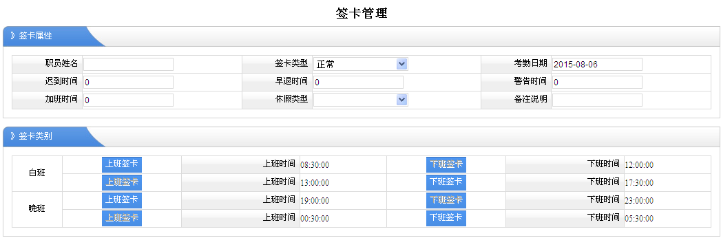 5、签卡类别:就是为那个班次,什么时间进行的签卡。