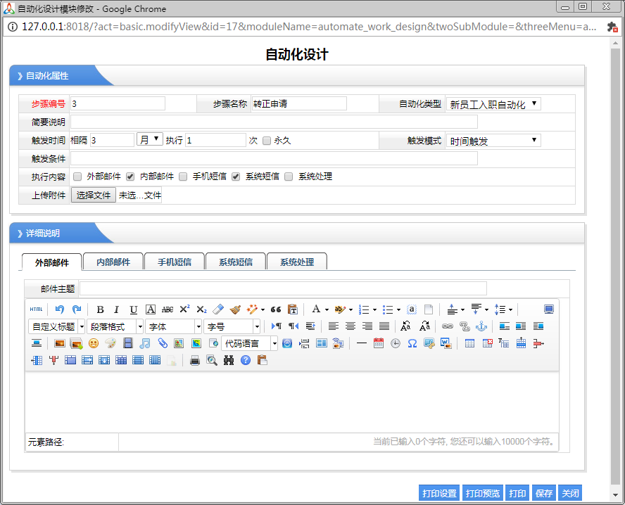 7、执行内容:外部邮件、内部邮件、手机短信、系统短信、系统处理
